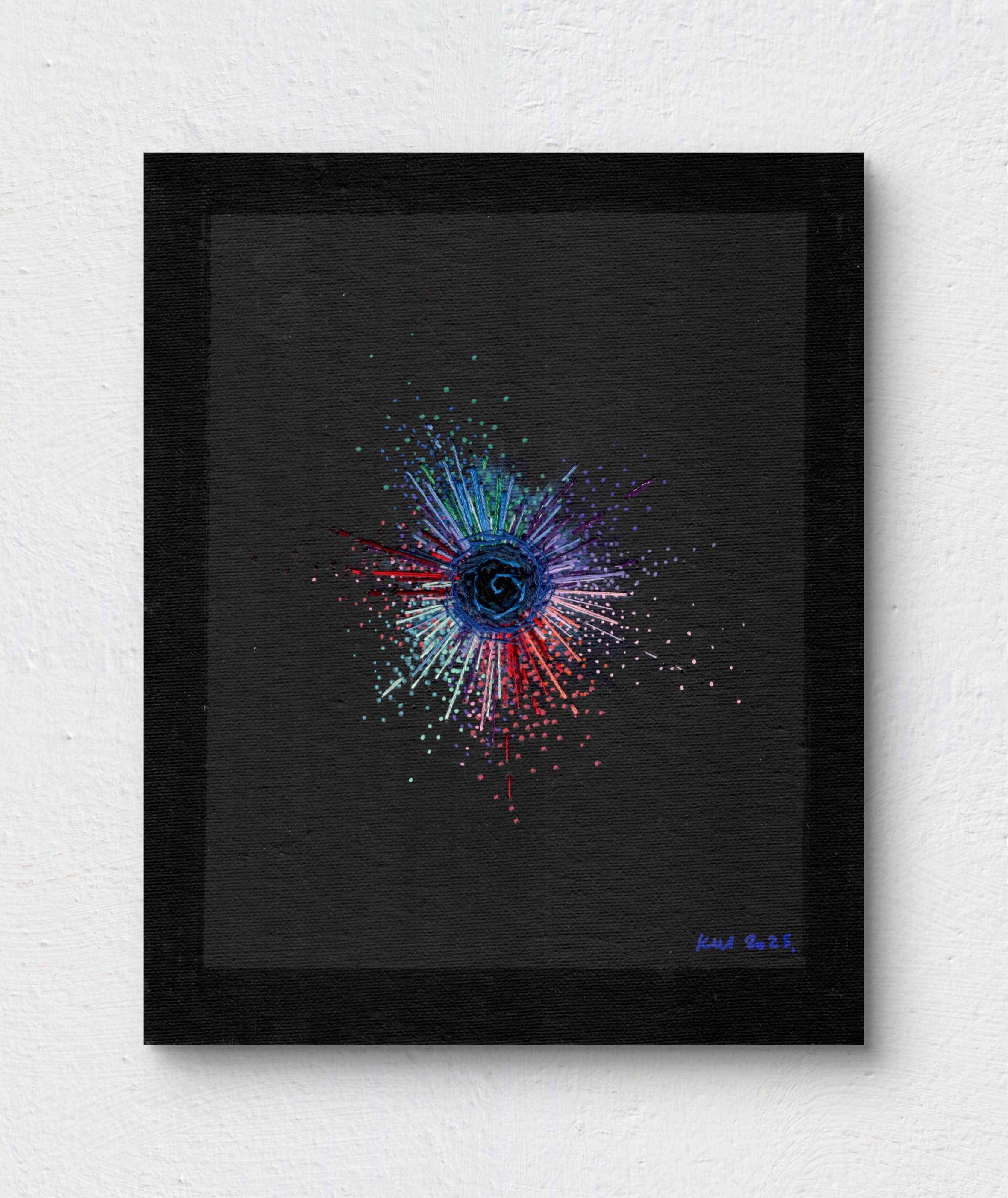 —A unique embroidery capturing a specific moment of energy and presence.